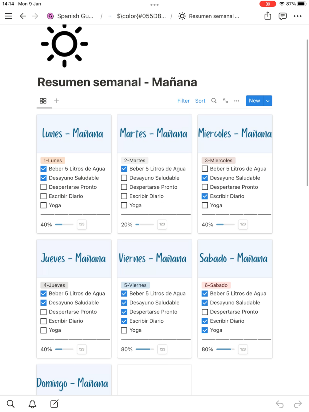 - Es normal, de manera automatica cada dia se van creando los registros correspondientes para dicho dia (incluido en mi plantilla de ejemplo la cual duplicais). Al duplicar la plantilla, Notion detecta que todos esos registros se han creado en el momento de duplicarla para vuestra plantilla por lo que os los mostrara todos en la portada porque los filtros estan configurados para mostrar los registros del dia.